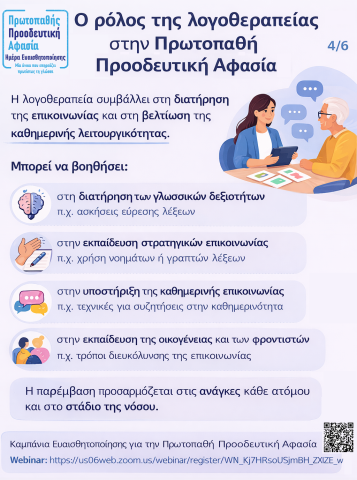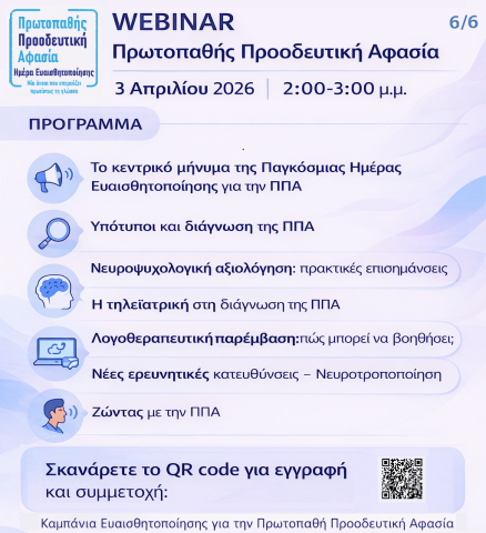 Τo Τμήμα Λογοθεραπείας σε συνεργασία με την Ελληνική Εταιρεία Άνοιας και την Εταιρεία Alzheimer Αθηνών, την Παρασκευή 3 Απριλίου, 14:00–15:00, διοργανώνει διαδικτυακή εκδήλωση/webinar για την Πρωτοπαθή Προοδευτική Αφασία (ΠΠΑ), στο πλαίσιο της Διεθνούς Ημέρας Ευαισθητοποίησης για την ΠΠΑ 2026.